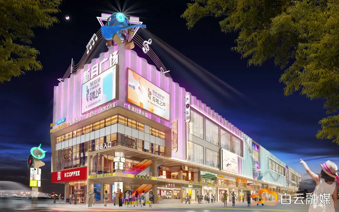 新月广场拟打造为一个以开放式音乐主题街区为空间创新特色,集音乐创作发行、行业交流、商务办公、演出、展览、休闲娱乐、文化体验、艺术培训、直播带货和音乐主题商业经营于一体的商业综合体。